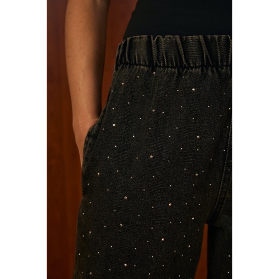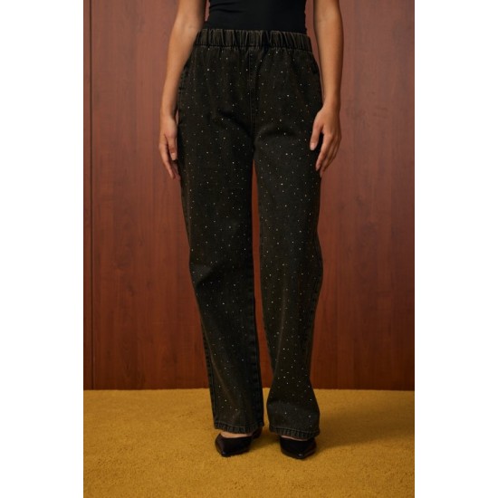 • Pantolon genelinde dağınık taş detayları yer alır, parlak ve dikkat çekici bir görünüm kazandırır