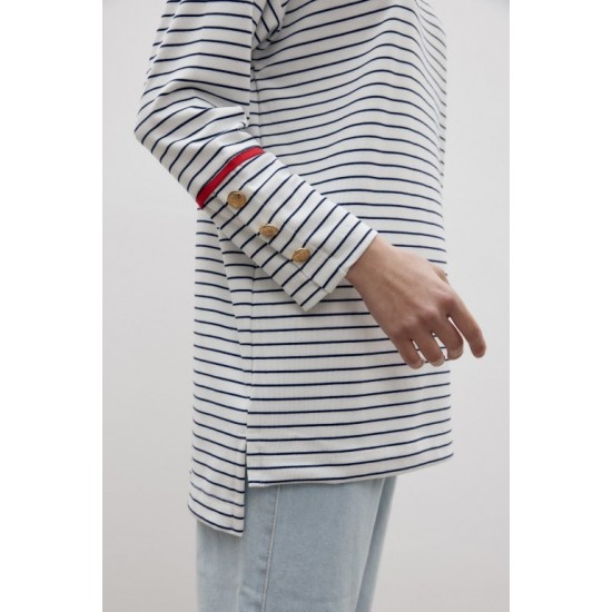 Şıklığı ve konforu bir arada sunan çizgili oversize tunik, günlük kombinlerinize modern ve rahat bir hava katıyor. Yumuşak dokulu penye kumaşı sayesinde gün boyu konfor sağlarken, salaş kesimi ile hareket özgürlüğü sunar. Kırmızı detaylarıyla klasik çizgili desenine modern bir dokunuş eklenmiştir.