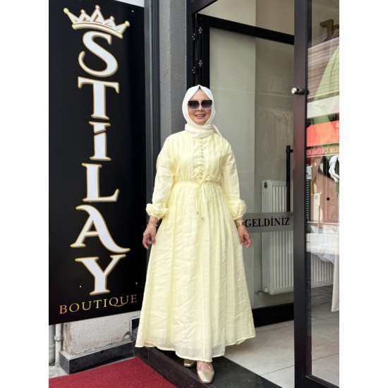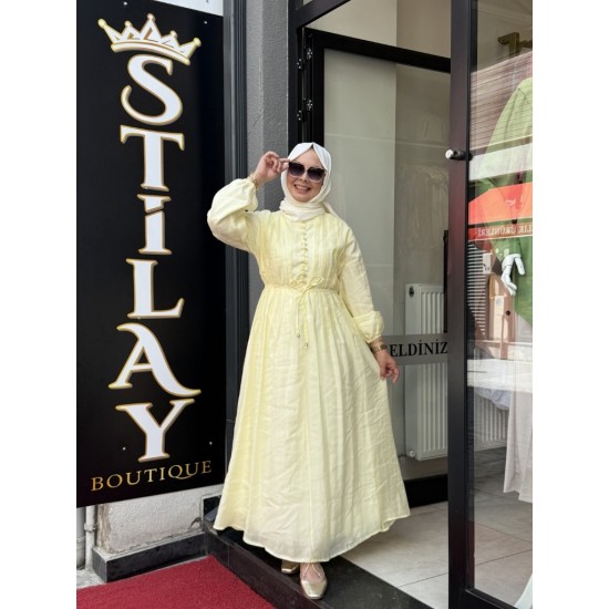 NERVÜR DİKİŞ DETAYLI ELBİSE SOFT SARI