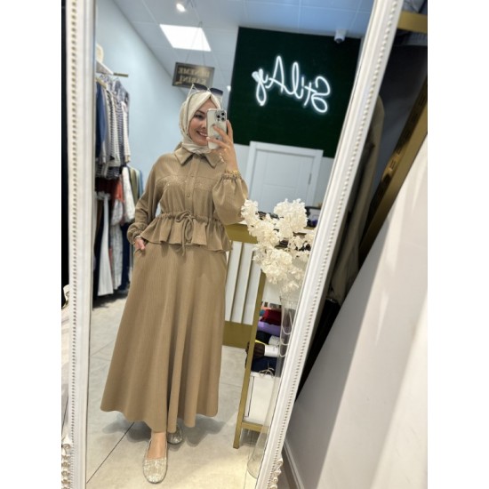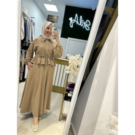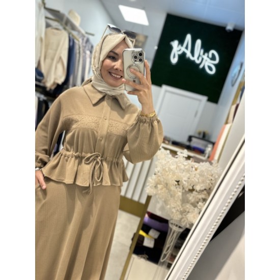 BEL BÜZGÜLÜ NAKIŞ DETAYLI ETEKLİ TAKIM KOYU BEJ