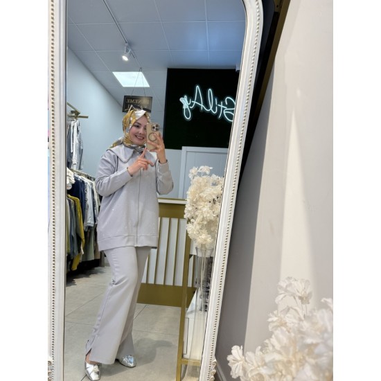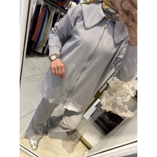 GEMİCİ YAKA TAŞ DETAYLI TAKIM GRİ