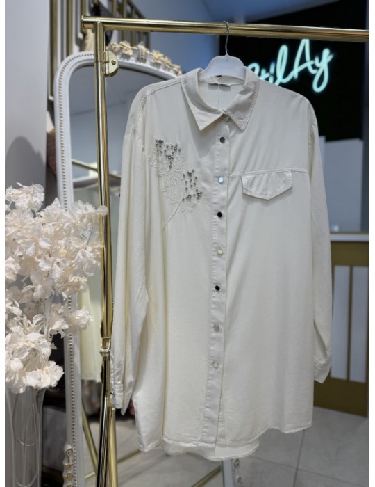 YAPRAK DESENLİ TAŞLI TENSEL GÖMLEK EKRU
