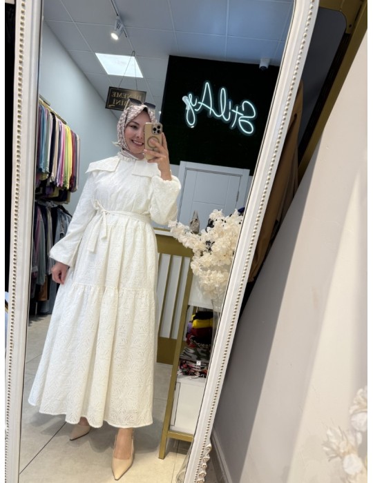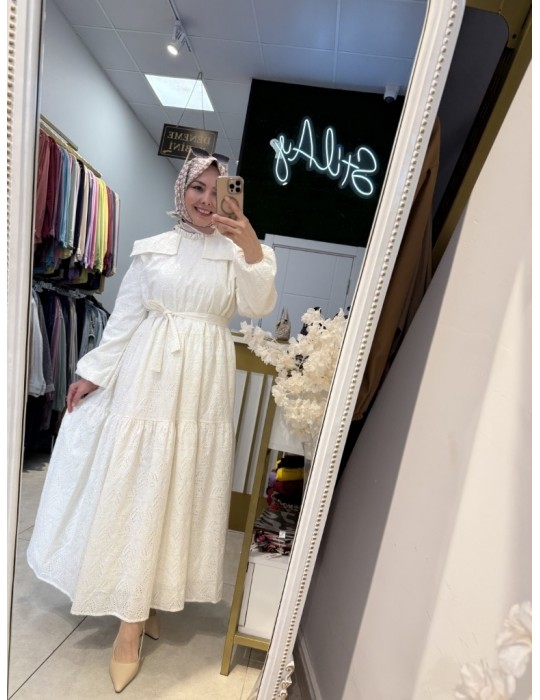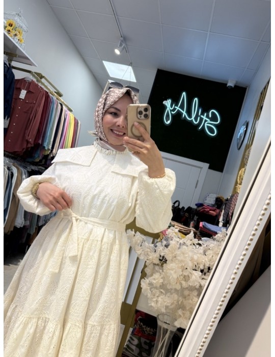 Zarif ve şık tasarımıyla dikkat çeken brode desenli uzun elbise, konfor ve şıklığı bir araya getiriyor. %100 pamuk kumaşı sayesinde nefes alabilir yapıya sahip olan bu elbise, astarlı iç kısmıyla rahat bir kullanım sunar. Takıp çıkarılabilir kemeri sayesinde belinizi vurgulayarak farklı tarzlarda kombin yapmanıza olanak tanır.