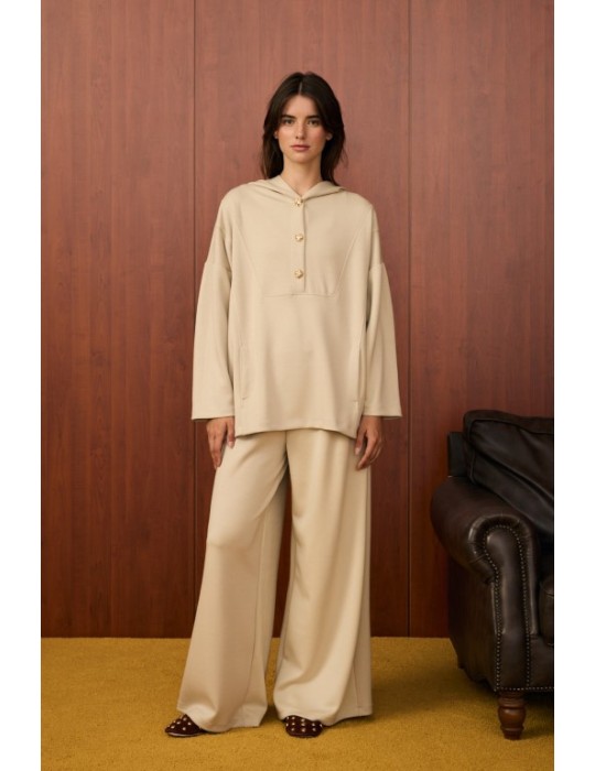 Detaylar: Gold düğme detaylı kapüşonlu tunik, geniş paçalı pantolon