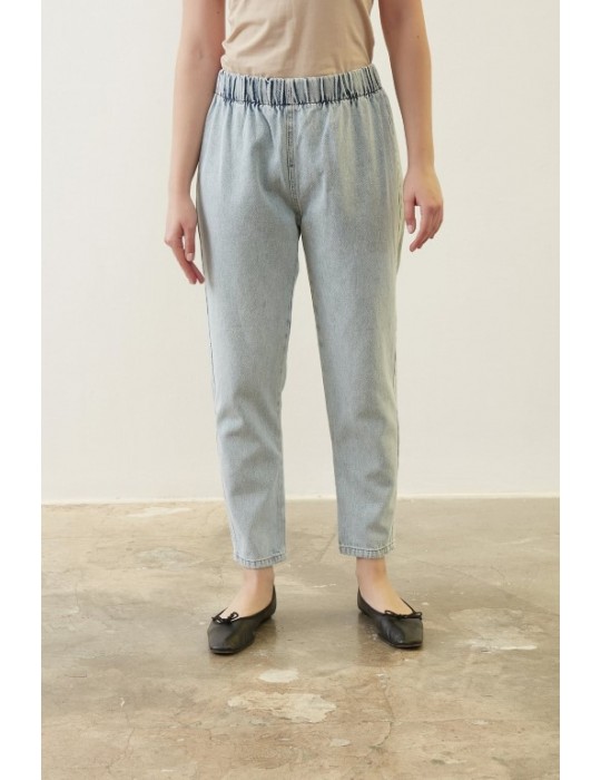 Beli Lastikli Düğme Detaylı Denim Pantolon
