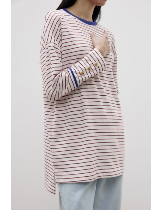 Şıklığı ve konforu bir arada sunan çizgili oversize tunik, günlük kombinlerinize modern ve rahat bir hava katıyor. Yumuşak dokulu penye kumaşı sayesinde gün boyu konfor sağlarken, salaş kesimi ile hareket özgürlüğü sunar. Kırmızı detaylarıyla klasik çizgili desenine modern bir dokunuş eklenmiştir.