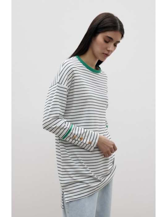 Şıklığı ve konforu bir arada sunan çizgili oversize tunik, günlük kombinlerinize modern ve rahat bir hava katıyor. Yumuşak dokulu penye kumaşı sayesinde gün boyu konfor sağlarken, salaş kesimi ile hareket özgürlüğü sunar. Kırmızı detaylarıyla klasik çizgili desenine modern bir dokunuş eklenmiştir.