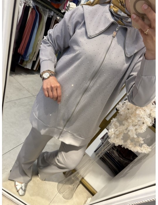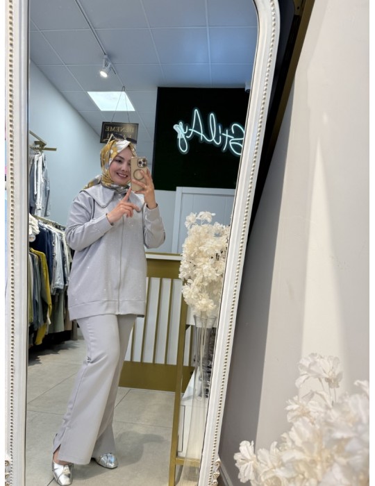 GEMİCİ YAKA TAŞ DETAYLI TAKIM GRİ