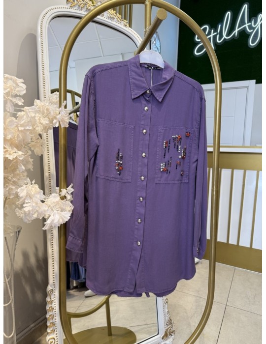 TAŞ İŞLEMELİ TENSEL GÖMLEK MOR