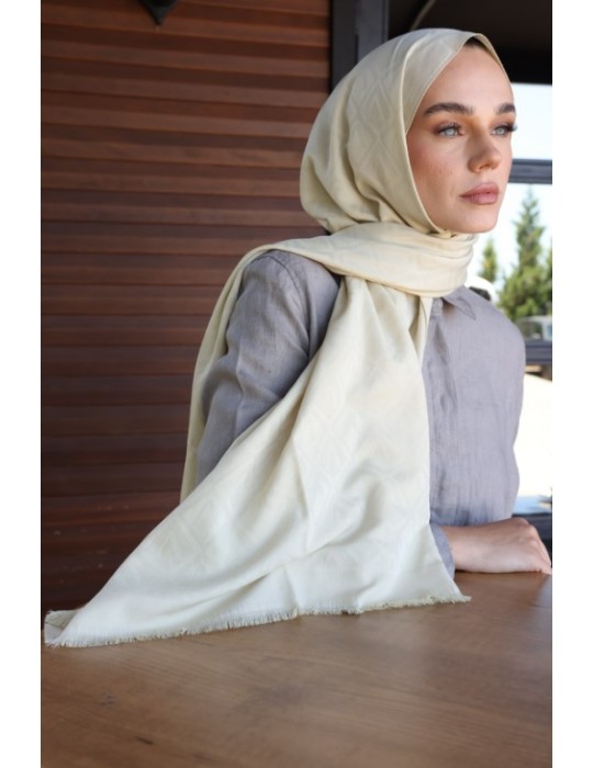 Doğal dokusuyla öne çıkan bu özel kumaş, pamuk içeriğiyle yumuşak ve nefes alabilen bir yapı sunarken, jakar dokuma tekniği sayesinde desenlerini kumaşın içine işleyerek zarif ve kalıcı bir görünüm kazandırır. Yüzeyinde kayganlık hissi oluşturmaz; mat ve doğal yapısıyla gün boyu konforlu bir kullanım sağlar.