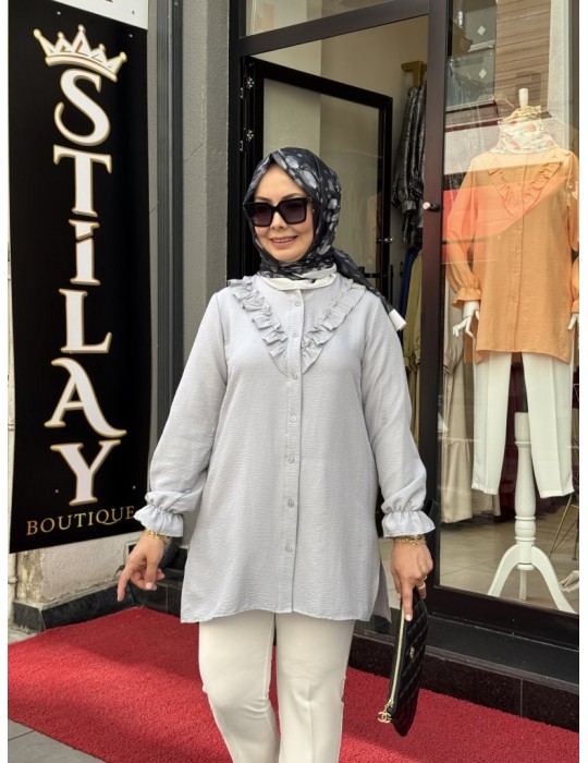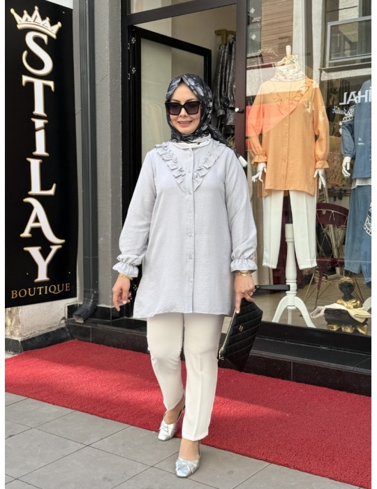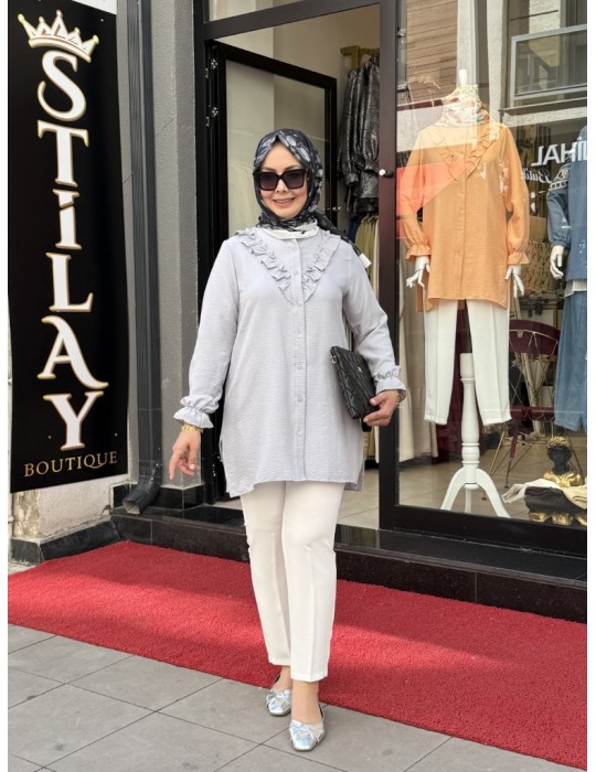 YAPRAK DESENLİ TAŞLI TENSEL GÖMLEK EKRU