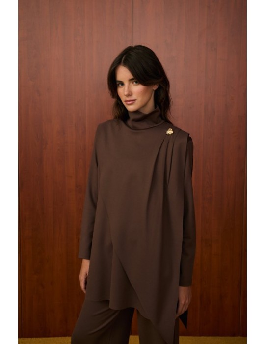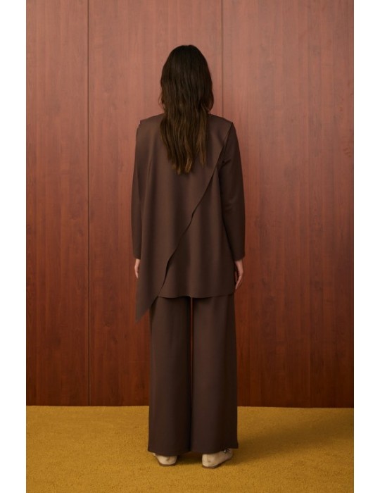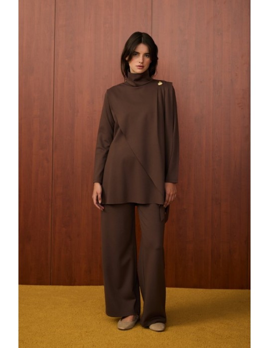 Üst parça asimetrik kesime sahip olup, omuz kısmında dekoratif metal düğme detayı bulunmaktadır.