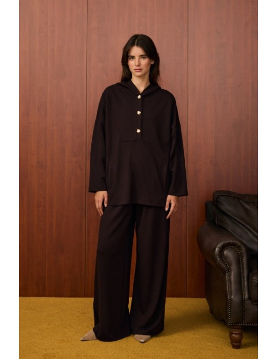 Detaylar: Gold düğme detaylı kapüşonlu tunik, geniş paçalı pantolon