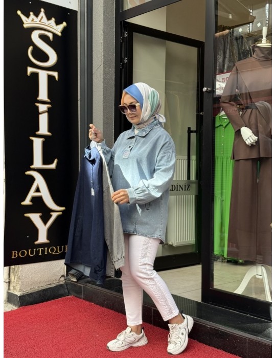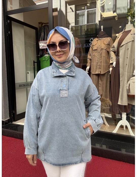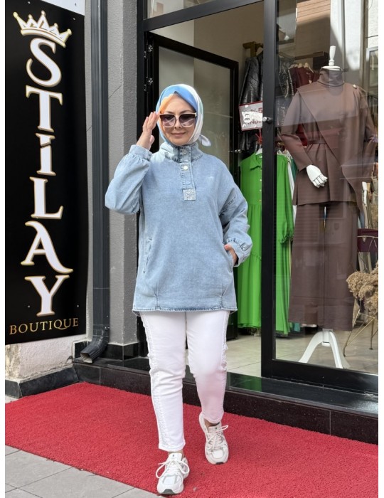 ÇITÇITLI TAŞ DETAYLI KOT TUNİK AÇIK MAVİ