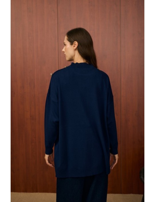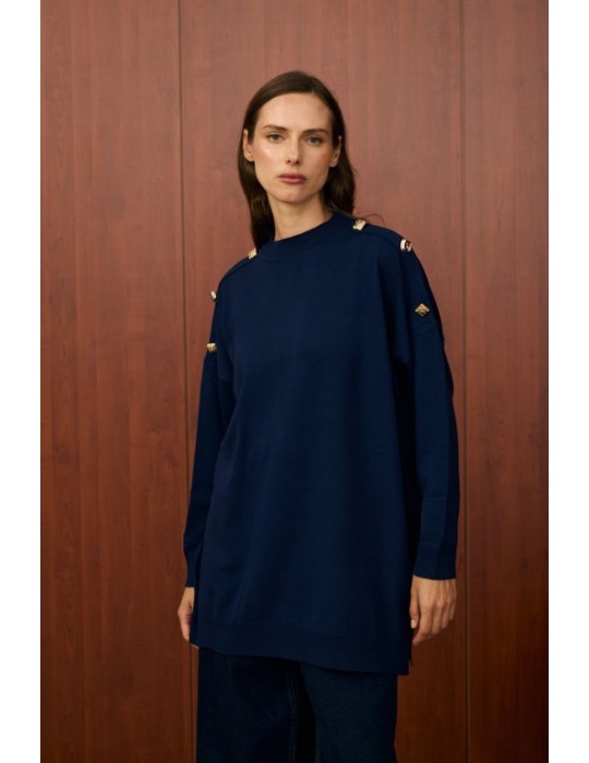 Minimal ve zarif duruşuyla dikkat çeken bu triko tunik, omuz ve kol detaylarındaki altın renkli düğmelerle modern bir hava kazanıyor. Salaş kesimiyle rahatlık sunarken, kaliteli iplik karışımı sayesinde dört mevsim kullanım için uygundur.