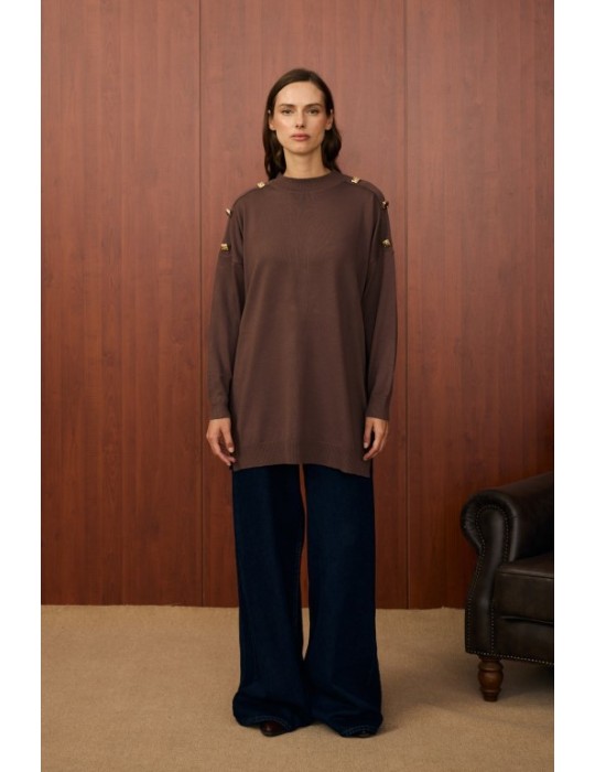 Minimal ve zarif duruşuyla dikkat çeken bu triko tunik, omuz ve kol detaylarındaki altın renkli düğmelerle modern bir hava kazanıyor. Salaş kesimiyle rahatlık sunarken, kaliteli iplik karışımı sayesinde dört mevsim kullanım için uygundur.