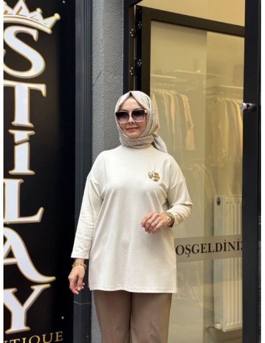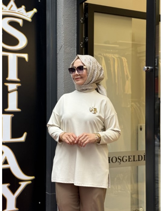 Renk: Üst parça açık bej, alt parça koyu kahverengi pileli etek ile kombinlenmiştir