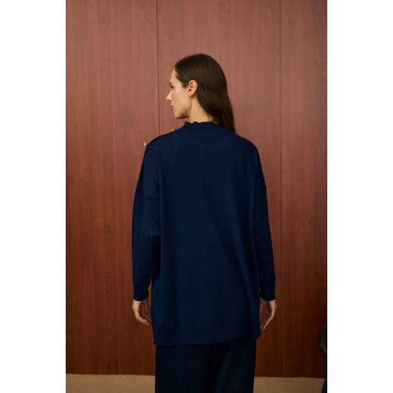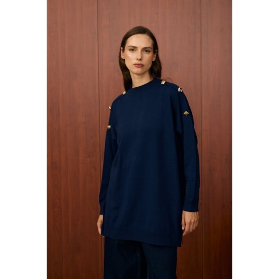 Minimal ve zarif duruşuyla dikkat çeken bu triko tunik, omuz ve kol detaylarındaki altın renkli düğmelerle modern bir hava kazanıyor. Salaş kesimiyle rahatlık sunarken, kaliteli iplik karışımı sayesinde dört mevsim kullanım için uygundur.